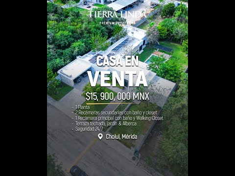 <p><span style="font-size: 14px;">Residencia de un piso en venta, ubicada en Privada Hacienda Cholul, al norte de Mérida, Yucatán, dentro de fraccionamiento con vigilancia y acceso controlado. Diseño funcional con excelente conexión a áreas exteriores, todos los espacios cuentan con vista y acceso al jardín y alberca.</span></p><p><span style="font-size: 14px;"><br></span></p><div>Orientación Norte-Sur </div><div><span style="font-size: 14px;">1213m2 de terreno </span></div><div><span style="font-size: 14px;">449m2 de construcción</span></div><div><span style="font-size: 14px;">100m2 de terraza y garage </span></div><div><span style="font-size: 14px;"><br></span></div><div><br></div><div><span style="font-size: 14px;">Distribución: </span></div><div><br></div><div><span style="font-size: 14px;">- Recibidor</span></div><div>- Sala y comedor integrados, doble altura, con vista y acceso al jardín y alberca. <div>- Medio baño de visitas.</div><div>- Cocina integral equipada con Alacena y bodega.</div></div><div><span style="font-size: 14px;">- Recámara principal con a</span><span style="font-size: 14px;">mplio walking closet, b</span><span style="font-size: 14px;">año completo con terraza interna , v</span><span style="font-size: 14px;">ista y acceso al jardín y alberca.</span></div><div><span style="font-size: 14px;">- 2 recámaras secundarias con c</span><span style="font-size: 14px;">lóset, b</span><span style="font-size: 14px;">año completo cada una, v</span><span style="font-size: 14px;">ista y acceso al jardín y alberca.</span></div><div><span style="font-size: 14px;">- Habitación con aislamiento acústico. Puede ser estudio o cuarta recamara.</span></div><div><span style="font-size: 14px;">- Cuarto de Lavado y servicio</span></div><div><span style="font-size: 14px;">- Bodega </span></div><div><span style="font-size: 14px;">- Estacionamiento 3 lugares techado y 3 sin techar </span></div><div><br></div><div><span style="font-size: 14px;">Área exterior: </span></div><div><br></div><div><span style="font-size: 14px;">- Terraza</span></div><div><span style="font-size: 14px;">- Alberca</span></div><div><span style="font-size: 14px;">- Amplio Jardín</span></div><div><br></div><div><span style="font-size: 14px;">Aspectos generales: </span></div><div><br></div><div><span style="font-size: 14px;">- Impermeabilizada</span></div><div><span style="font-size: 14px;">- Paneles solares</span></div><div><span style="font-size: 14px;">- Aires acondicionados y ventiladores</span></div><div><span style="font-size: 14px;">- Cortinas y Persianas </span></div><div><span style="font-size: 14px;">- Carpintería de madera de Tzalam</span></div><div><span style="font-size: 14px;">- 3 pozos de agua, autosuficiente y evita inundaciones</span></div><div><span style="font-size: 14px;">- Tanque estacionario</span></div><div><span style="font-size: 14px;">- Circuito cerrado, camaras de seguridad </span></div><div><span style="font-size: 14px;">- Fraccionamiento privado con vigilancia</span></div><div><br></div> <p></p>